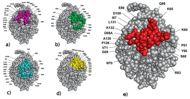 Figure : Comparison of predicted residues by EpiSearch (left) and experimentally observed antibody contact residues (right) in the X-ray co-crystal structure of the allergen Bla g 2.