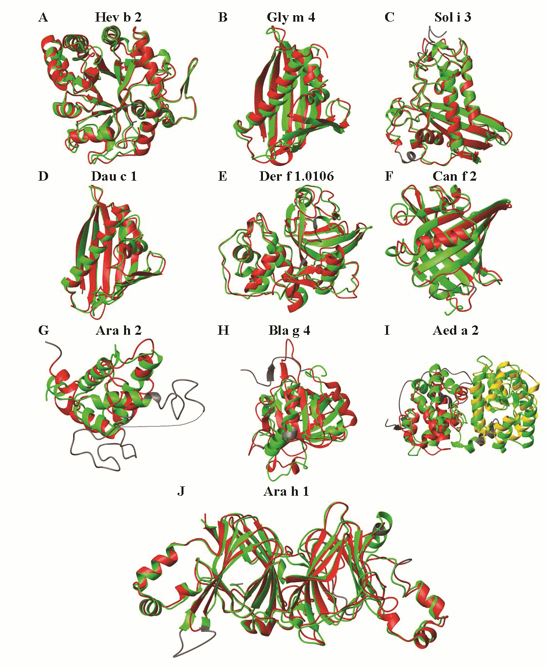 Figure : Model structures of allergeinc proteins in SDAP database. A sample of 3D models (red) which were predicted previously and later confirmed by experimental 3D structures (green) is shown in the figure on the right.